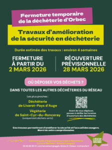 Nous vous informons que des travaux d’amélioration de la sécurité seront réalisés sur la déchèterie d’Orbec, entraînant une fermeture temporaire du site du 2 au 28 mars inclus.